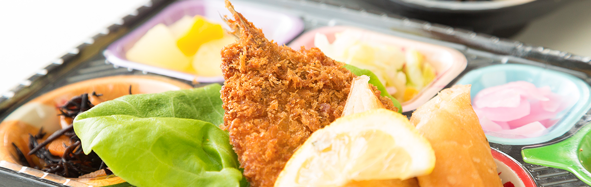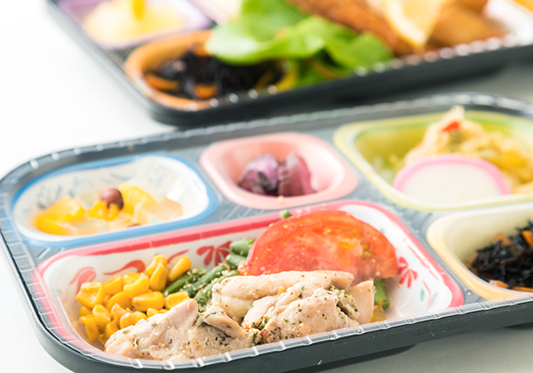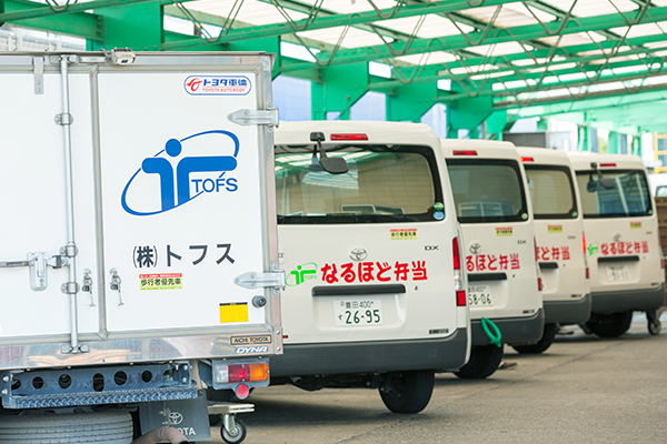 高齢者が元気に長生きするために、日々の食事はとても大切です。トフスでは、介護施設向けの給食および個人宅向けの配食サービスを通じて、地域の高齢者の健康を支えています。メニューは管理栄養士が栄養バランスを考え監修。主菜は日替わりで2種類あり、選ぶ楽しみもあります。また、食べやすさや嗜好も考慮し、主食はご飯またはお粥から、おかずは普通食、一口サイズ、刻み食を選択いただけます。魚の骨などは丁寧に取り除いていますから、安心してお召し上がりいただけます。
